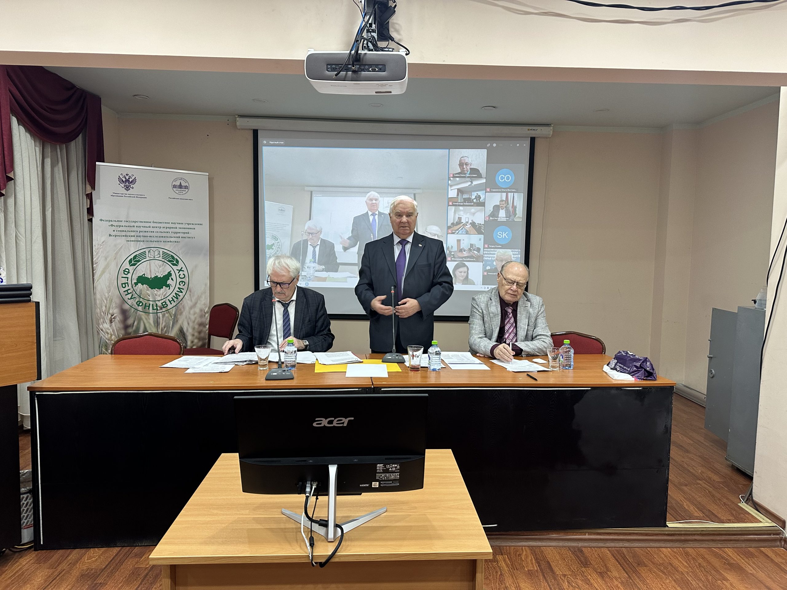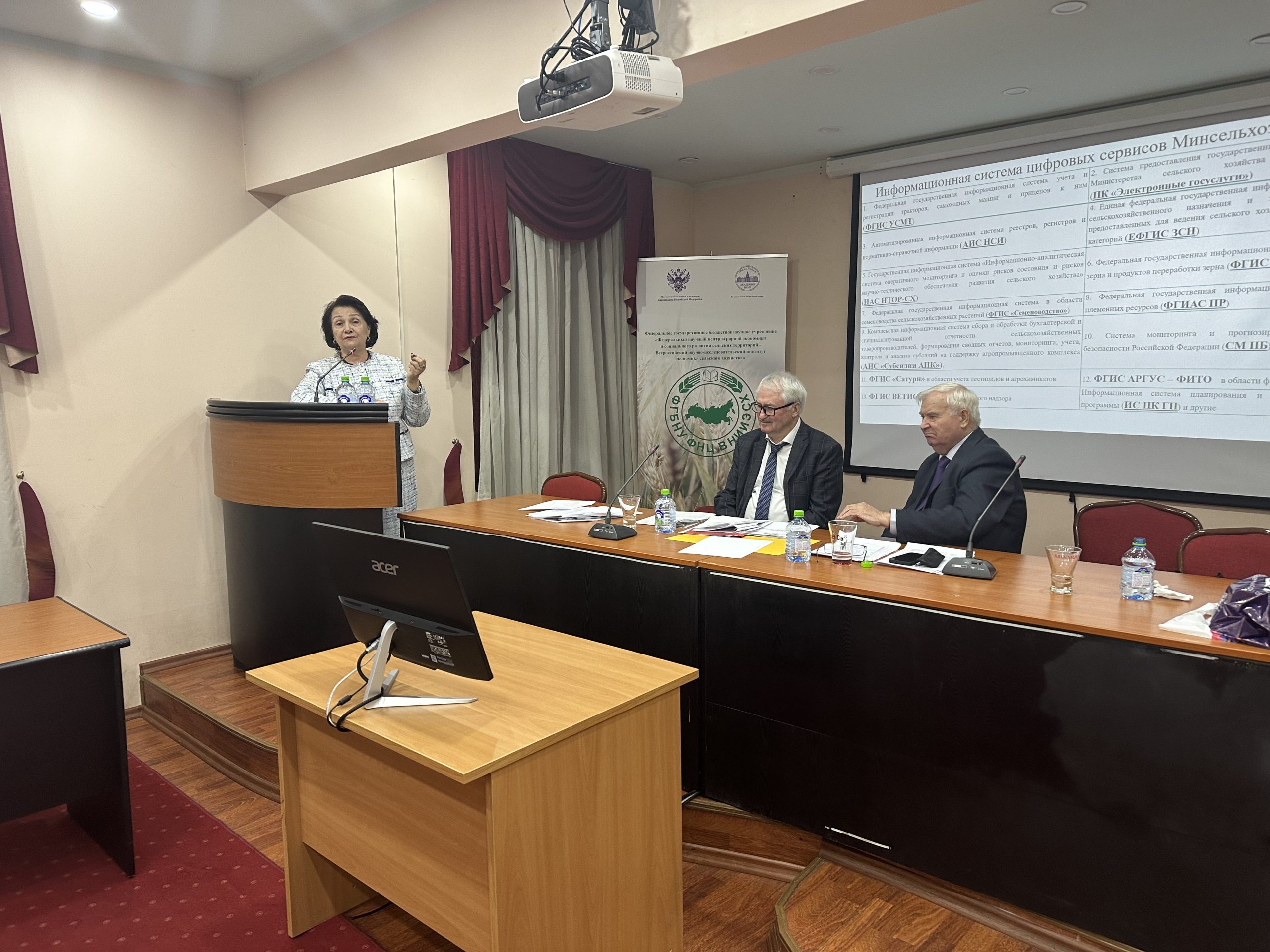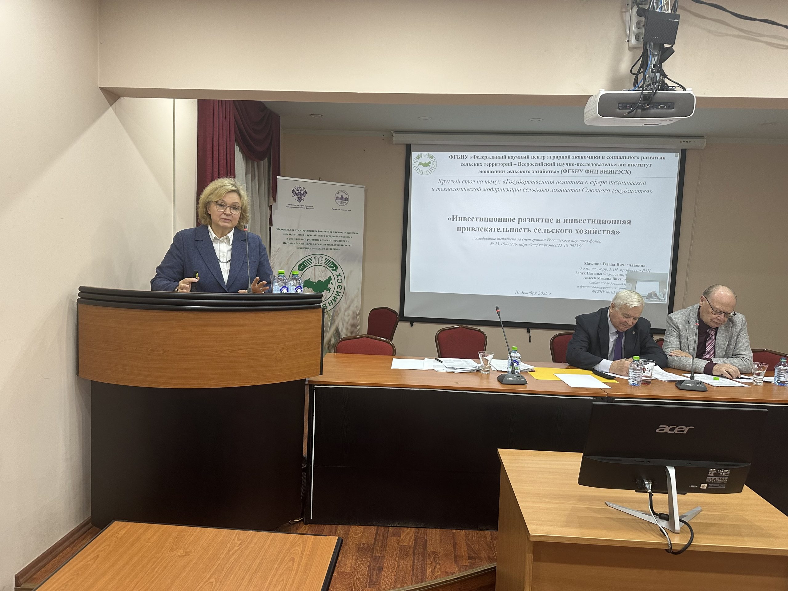 10 декабря 2025 года в зале Ученого совета ФГБНУ ФНЦ ВНИИЭСХ состоялся Круглый стол совместного заседания членов Научного совета секции экономики, земельных отношений и социального развития села и секции механизации, электрификации и автоматизации сельскохозяйственного производства ОСХН РАН на тему: «Государственная политика в сфере технической и технологической модернизации сельского хозяйства Союзного государства». Вел Круглый стол руководитель секции экономики, земельных отношений и социального развития села, академик РАН А.И.Алтухов. Открыл заседание Академик-секретарь Отделения сельскохозяйственных наук РАН, академик РАН, доктор технических наук, профессор, известный ученый, специалист в области технологий и средств механизации сельского хозяйства Ю.Ф.Лачуга. В работе Круглого стола приняли участие: первый заместитель директора ВИМ, академик РАН А.С.Дорохов, депутат Государственной Думы доктор экономических наук, профессор Н.В.Новичков, зав.отделом ФГБНУ ФНЦ ВНИИЭСХ, доктор экономических наук, член-корреспондент РАН В.В.Маслова, заместитель директора по научной работе Государственного предприятия «Институт системных исследований в АПК НАН Беларуси», доктор экономических наук, доцент С.А.Кондратенко, первый заместитель Председателя Международного Агропромышленного Союза А.Н.Миркин, зав.отделом ФГБНУ ФНЦ ВНИИЭСХ, доктор экономических наук, профессор И.С.Санду, директор Института повышения квалификации и переподготовки кадров АПК учреждения образования «Белорусский государственный аграрный технический университет», иностранный член РАН Н.С.Яковчик, директор Ассоциации сельхозмашиностроителей Республики Крым В.Н.Саенко, академик-секретарь, академик АН РЮ Х.М.Сафин и другие.